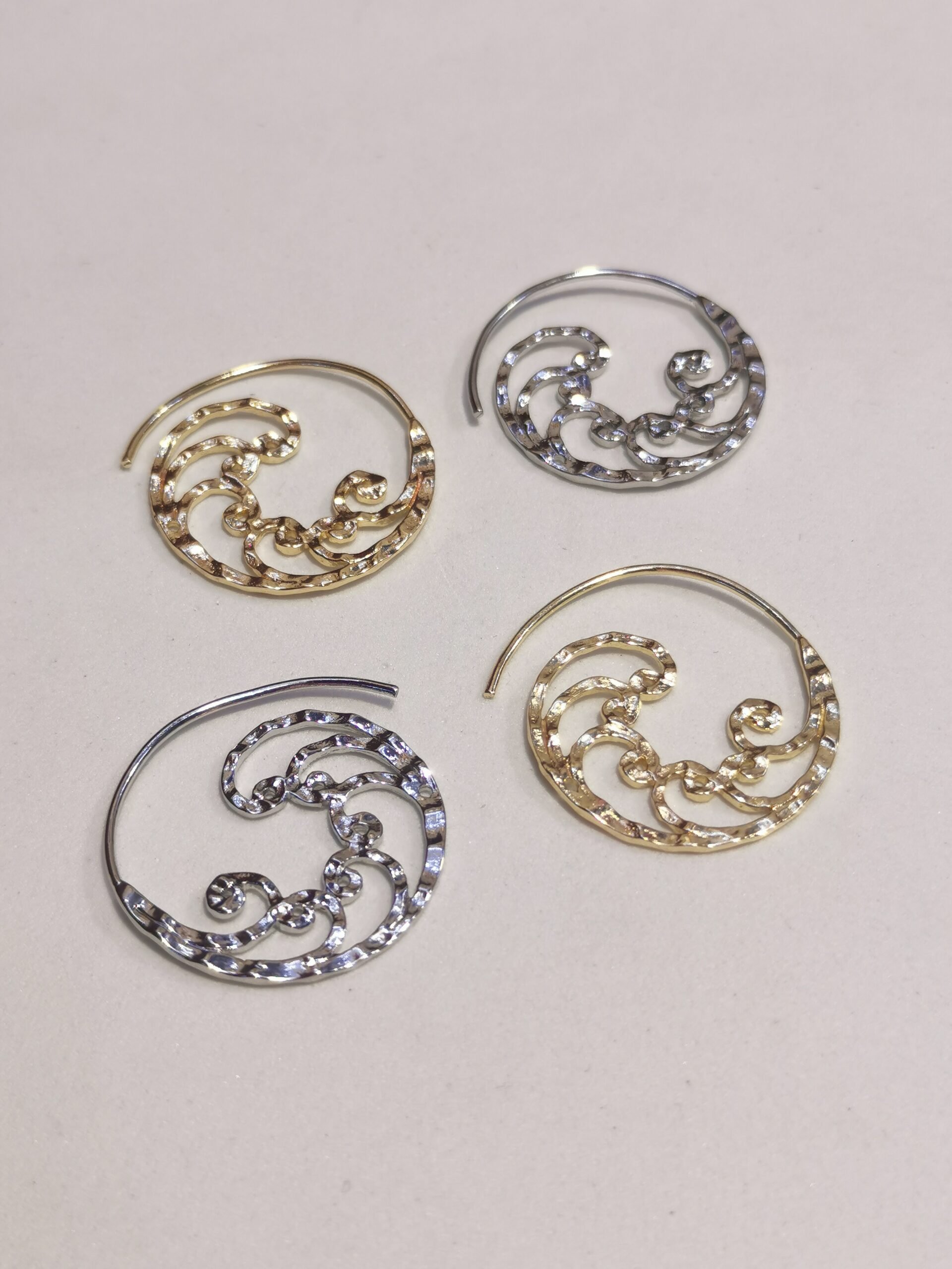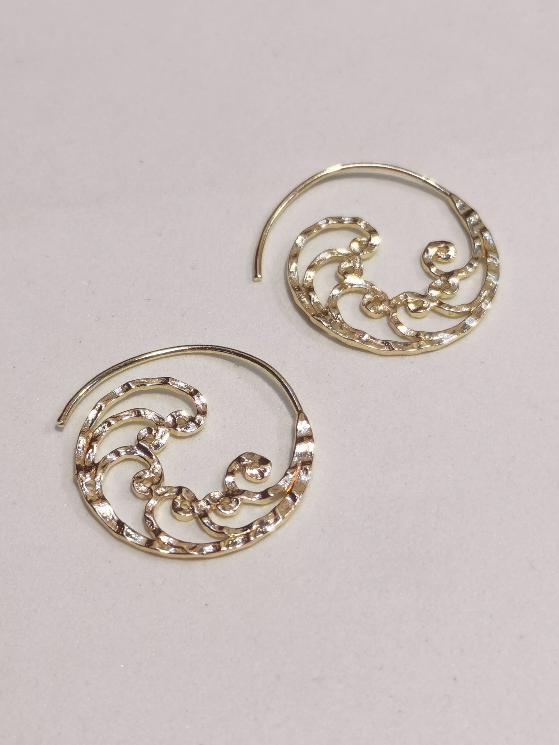 Dinamici orecchini in ottone con design a onda in ottone. Gioielli artigianali che catturano il movimento fluido del mare in un accessorio elegante.