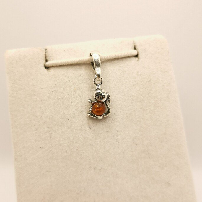 Il corpo del gatto in ambra ha il calore di un gatto al sole. L’argento 925 925 definisce orecchie, occhi e la coda sinuosa.