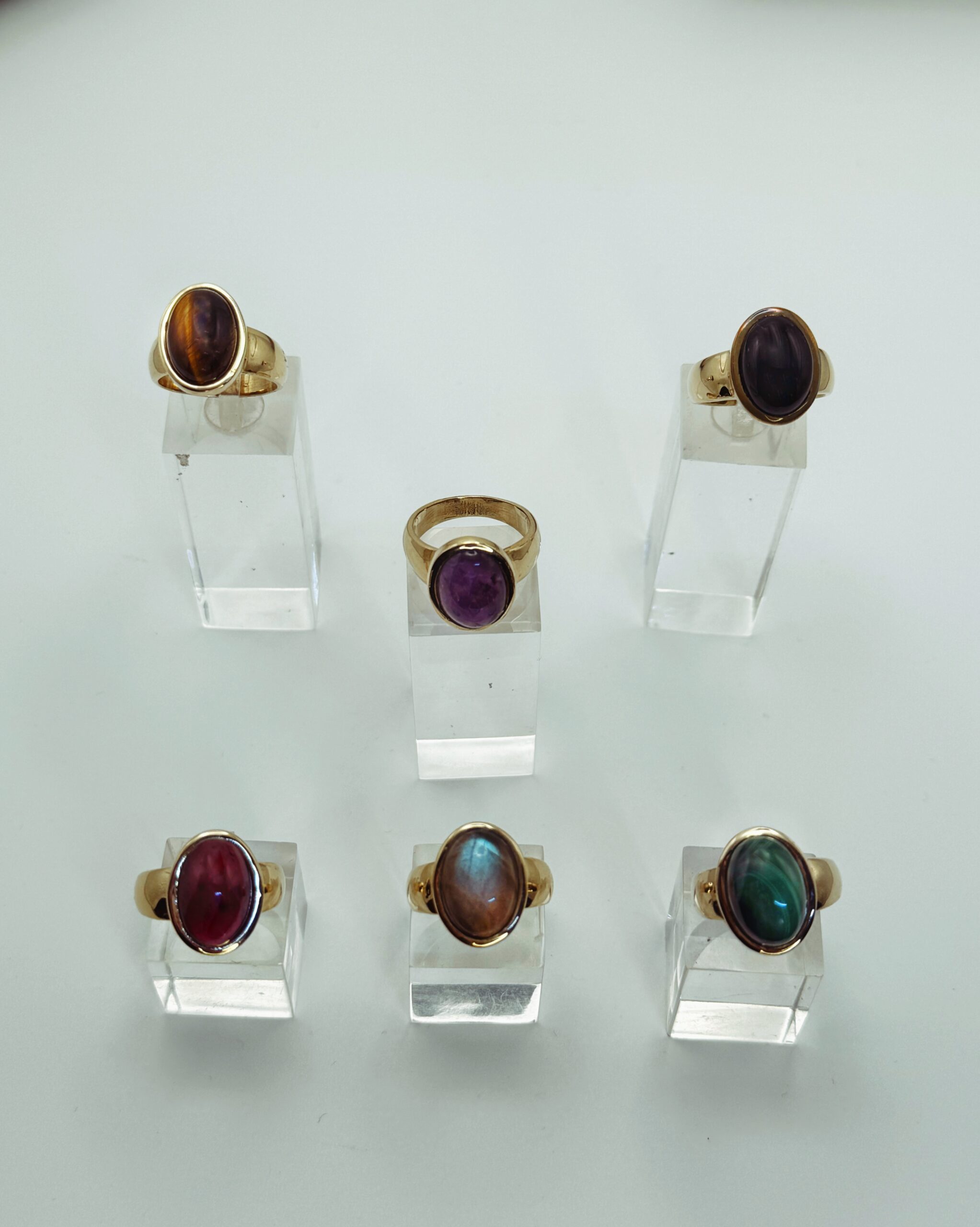 Preziosi anelli in ottone in ottone con cabochon naturali. Gioielli artigianali che portano gemme levigate alla mano con eleganza classica.