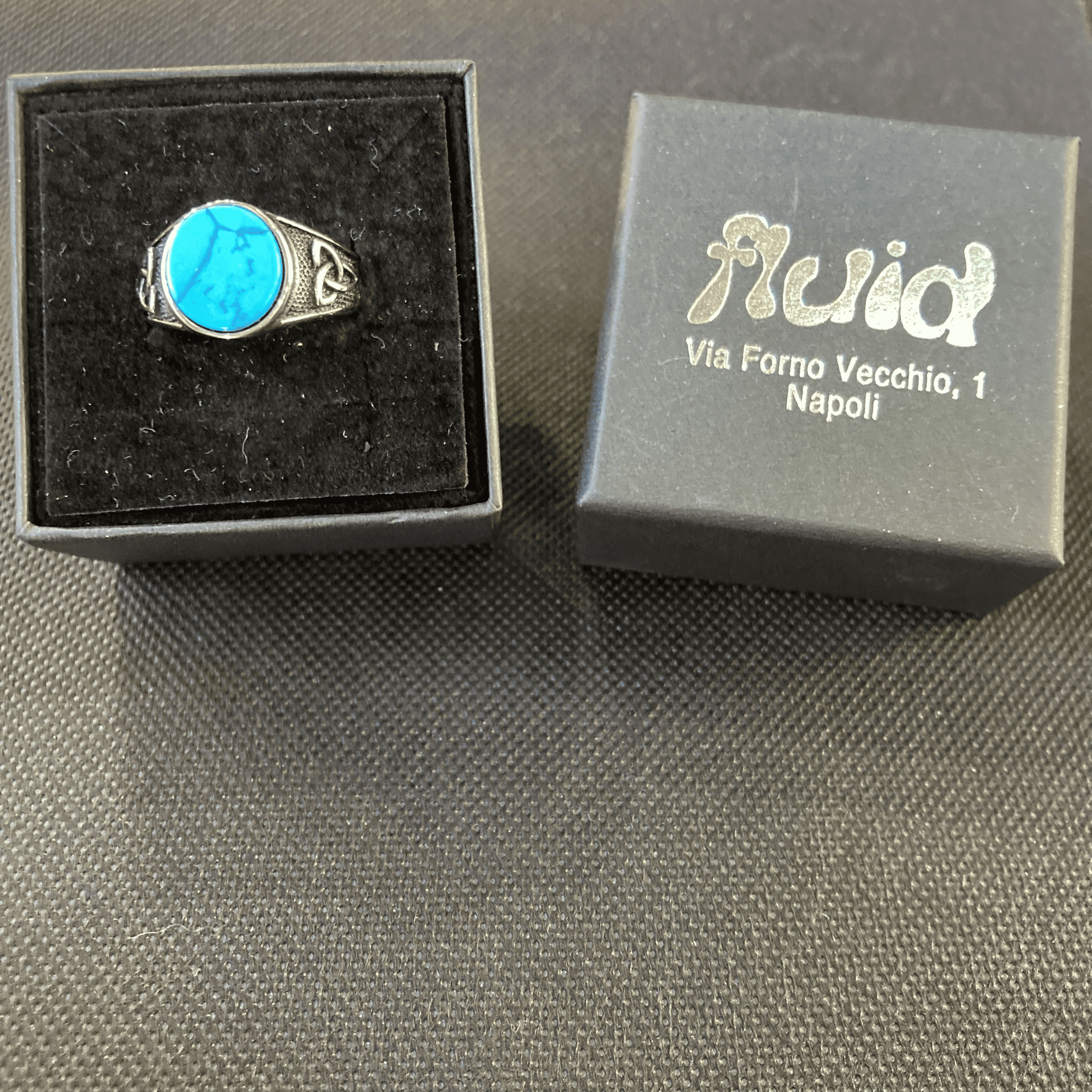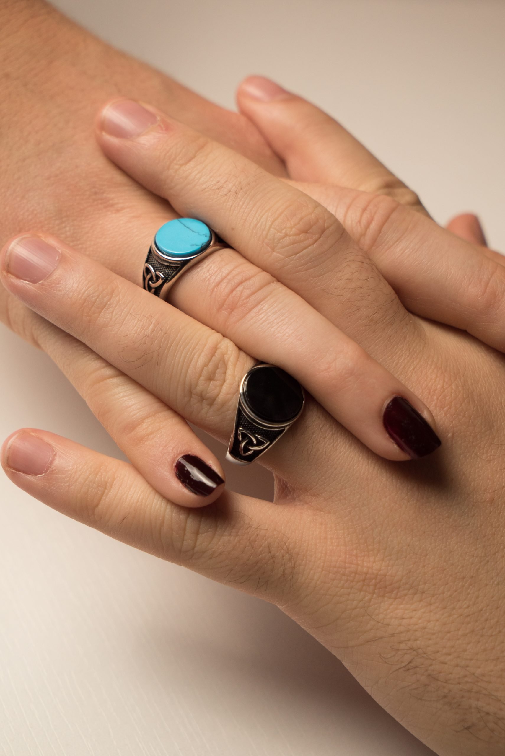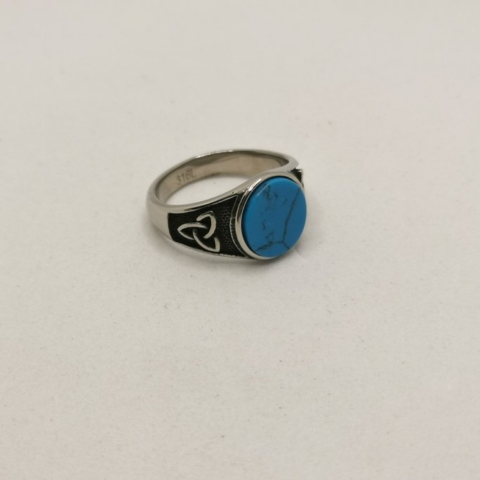 Anello Trischele in acciaio con pietra naturale incastonata al centro del simbolo celtico. Un gioiello ricco di significato spirituale che unisce tradizione antica e design contemporaneo.