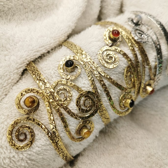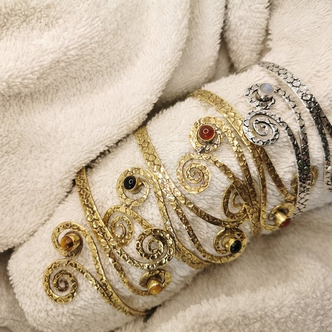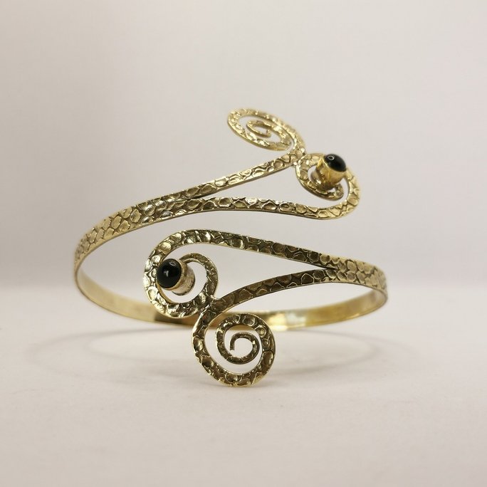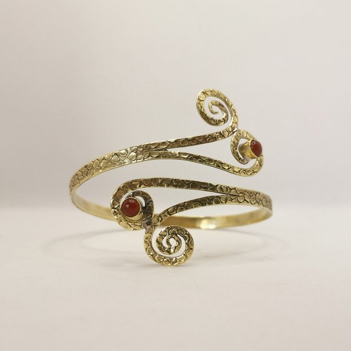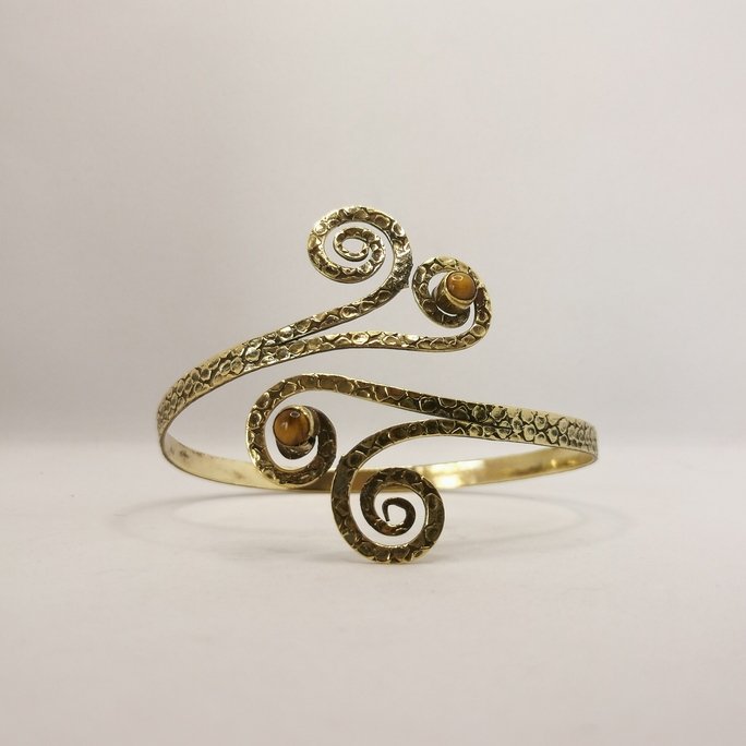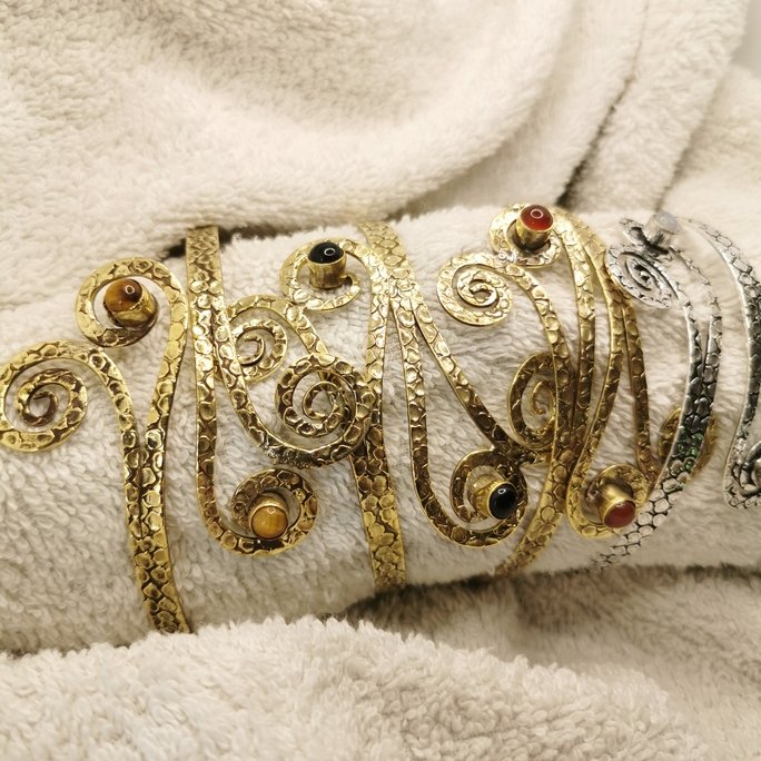 Questo tribale bracciale da braccio in ottone con pietre è un gioiello che unisce ornamento etnico e bellezza minerale. I pattern tribali in ottone lavorato artigianalmente sono arricchiti da pietre naturali per un accessorio di straordinaria presenza.