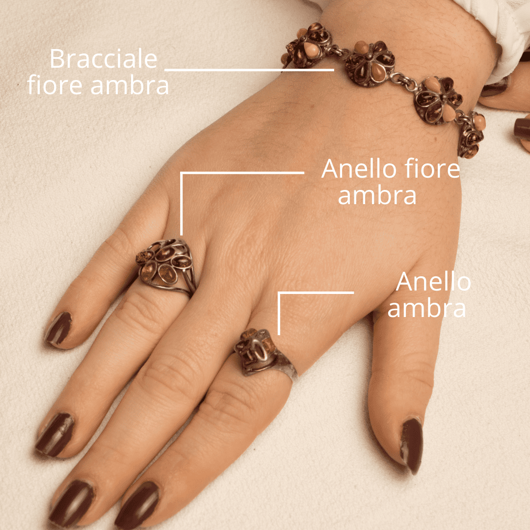 Conserva i pezzi separatamente per evitare graffi. Pulisci l’argento con panno specifico. L’Ambra richiede solo un panno morbido asciutto.