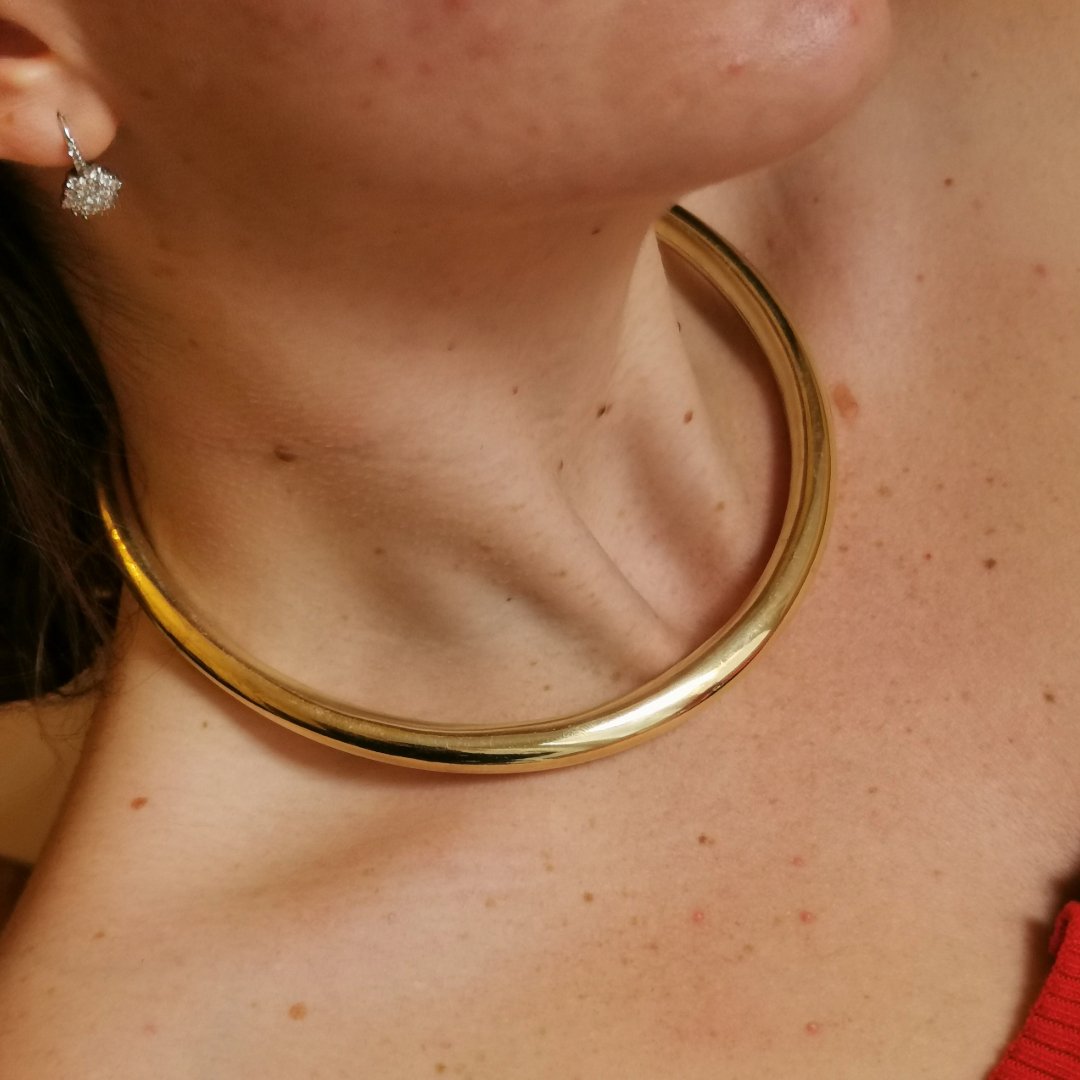 Audace choker etnico in ottone lavorato a mano. Gioiello artigianale con pattern tribali che celebra la diversità culturale del mondo.