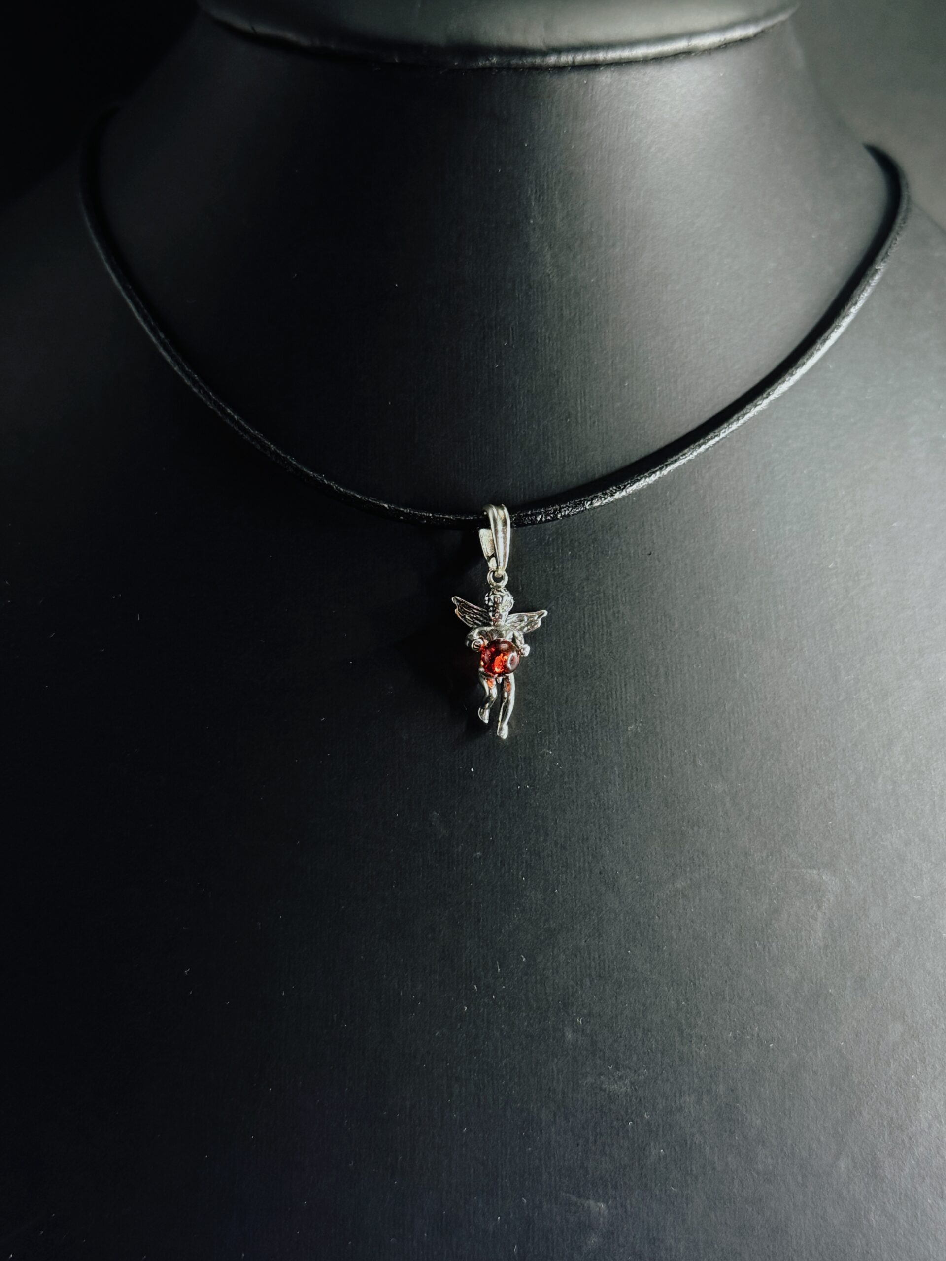 Ciondolo artigianale in argento 925 angioletto cherubino con cuore in ambra baltica cognac. Simbolo protezione, purezza, amore divino.