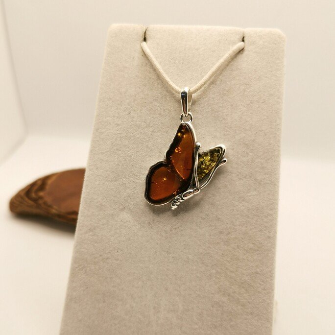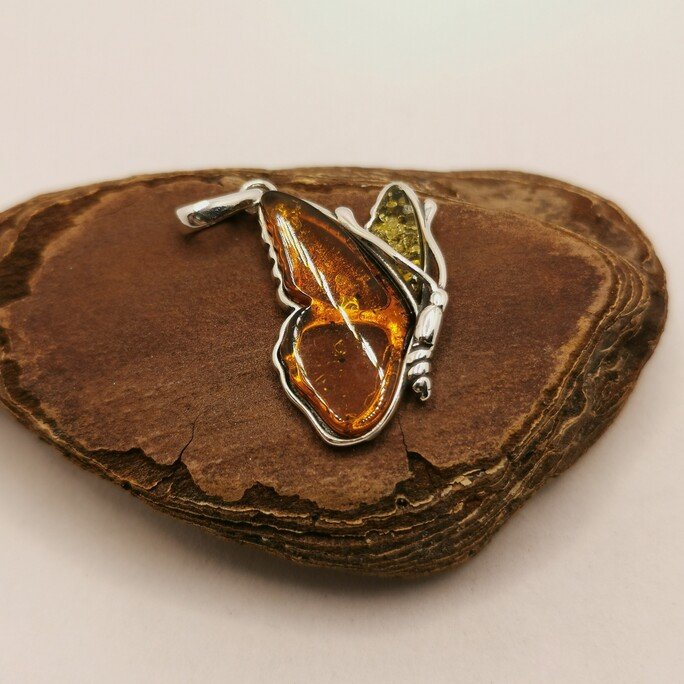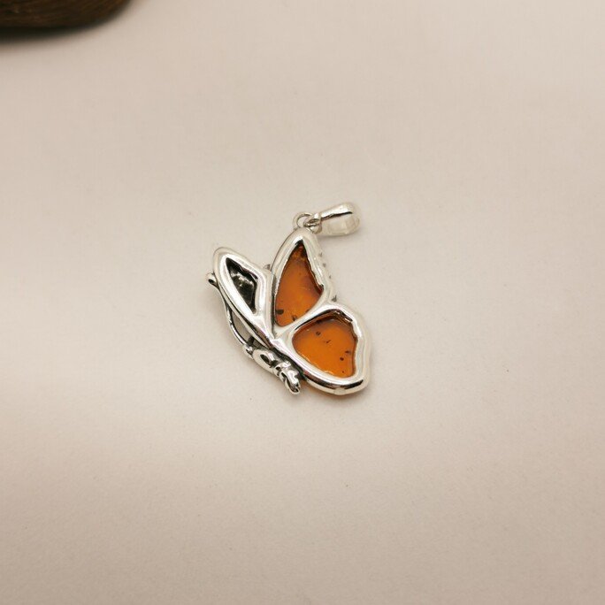 Le ali d’ambra catturano la luce come vetrate colorate. L’argento 925 925 forma il corpo elegante e le antenne della farfalla.