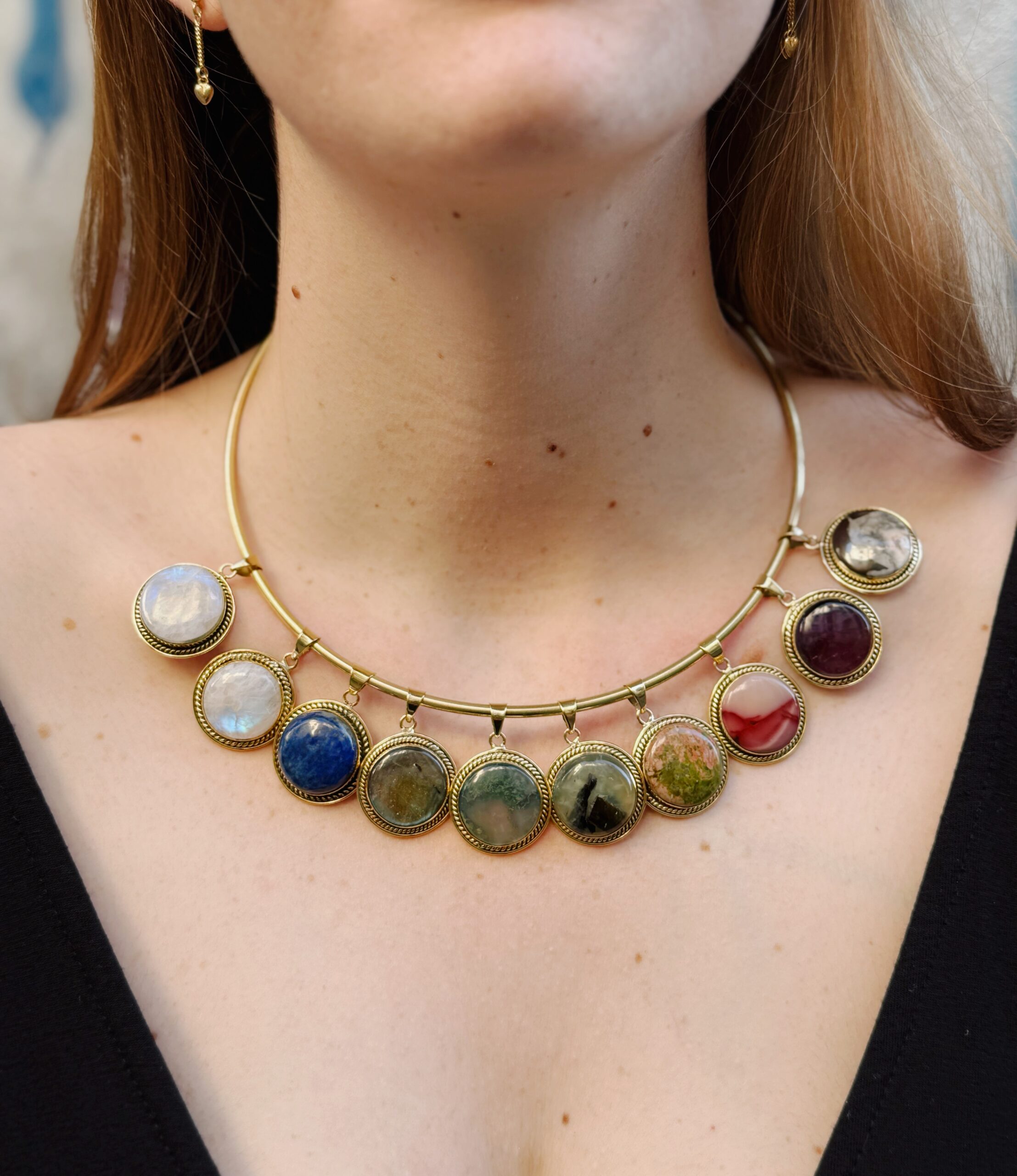 L’ottone lavorato a mano impiegato in questo ciondolo è selezionato per la sua qualità e modellato per creare una montatura che valorizza la forma perfettamente tonda del cabochon. Il metallo abbraccia la pietra esaltandone la cupola levigata.