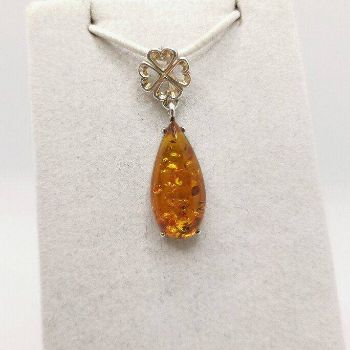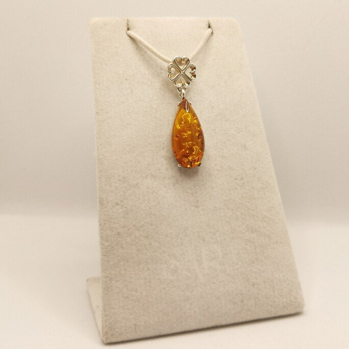 La goccia è la forma originaria dell’Ambra: resina che cola e si cristallizza. Questo ciondolo celebra quell’origine con una gemma tagliata a goccia perfetta.