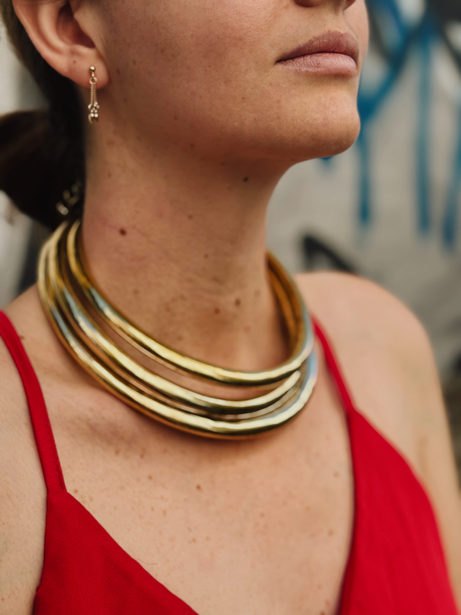 Elaborato collare in ottone etnico tris in ottone. Gioiello artigianale composto da tre elementi tribali per un impatto scenico potente.