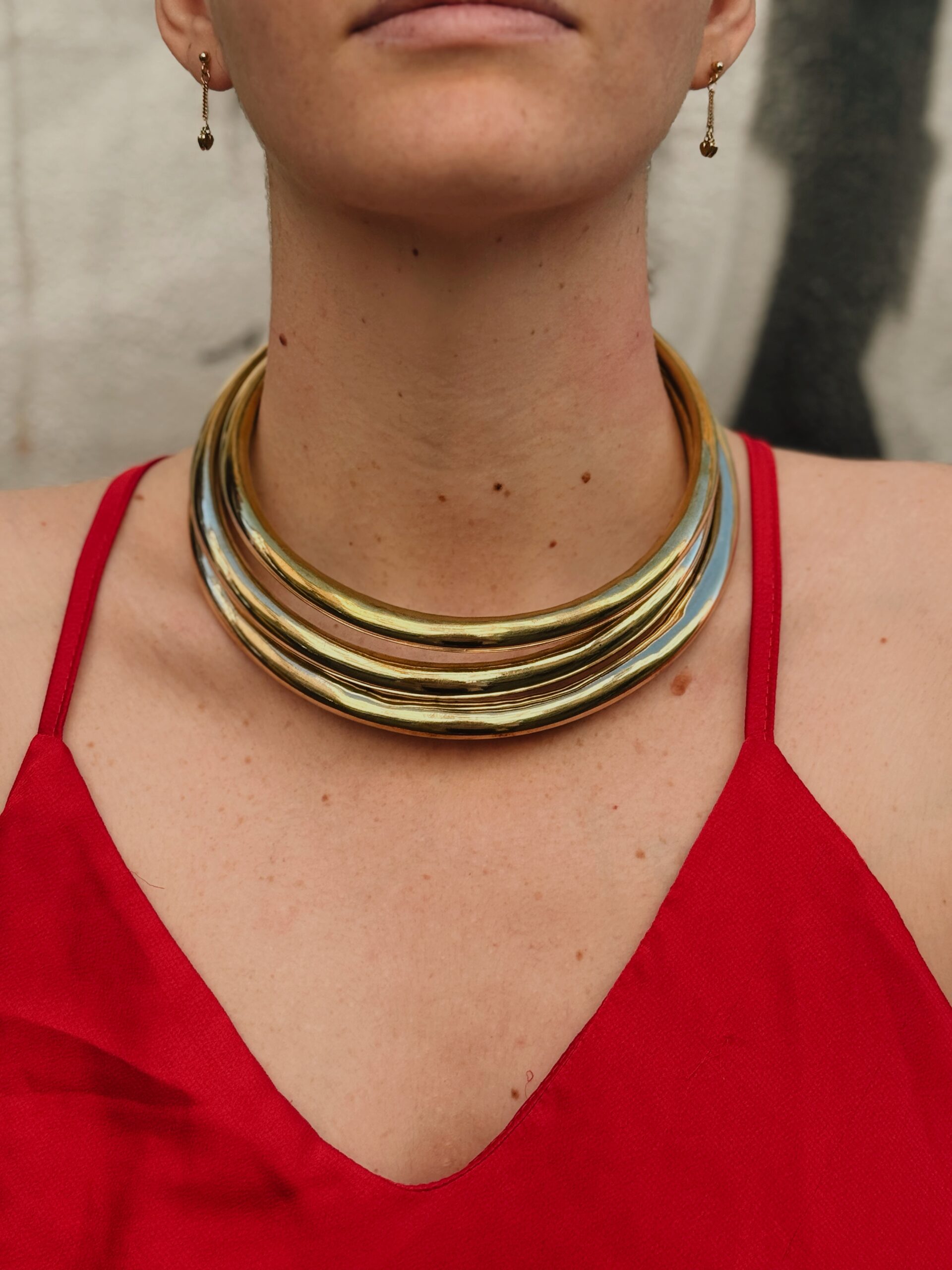 Il design a tre elementi crea ritmo visivo e profondità. Ogni componente dialoga con gli altri, costruendo un racconto decorativo che attraversa il collo con autorevolezza tribale. È un collare che fa dichiarazioni audaci.