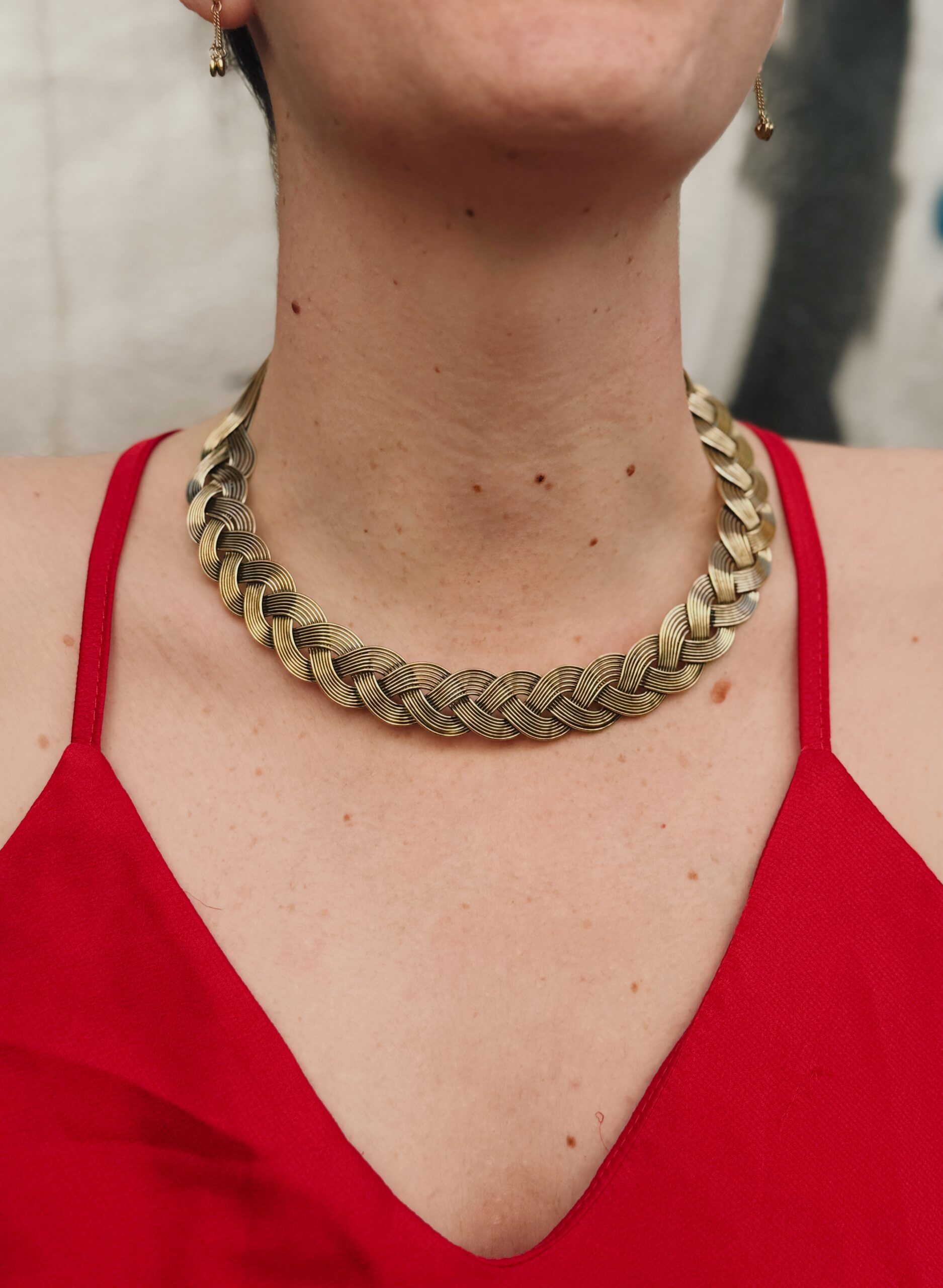 Intrecciato collare in ottone Treccia in ottone lavorato. Gioiello artigianale che celebra l’antica arte dell’intreccio in forma metallica.
