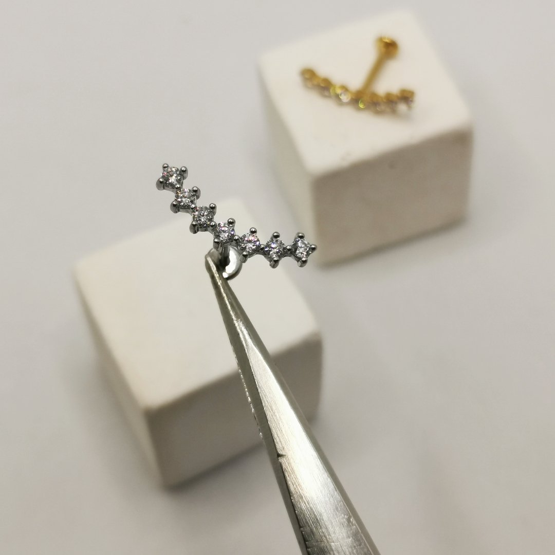 La barra in acciaio chirurgico 316L con filettatura interna garantisce il massimo comfort durante l’inserimento e l’uso quotidiano. I cristalli sono fissati con precisione per resistere all’usura.