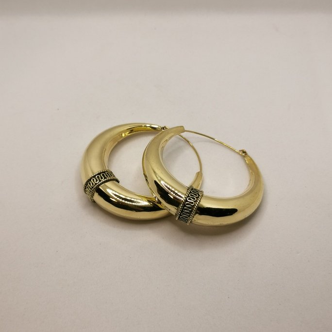 Audaci orecchini in ottone Etnic bold Hoop in ottone spesso. Gioielli artigianali con cerchi importanti decorati da pattern tribali di impatto.