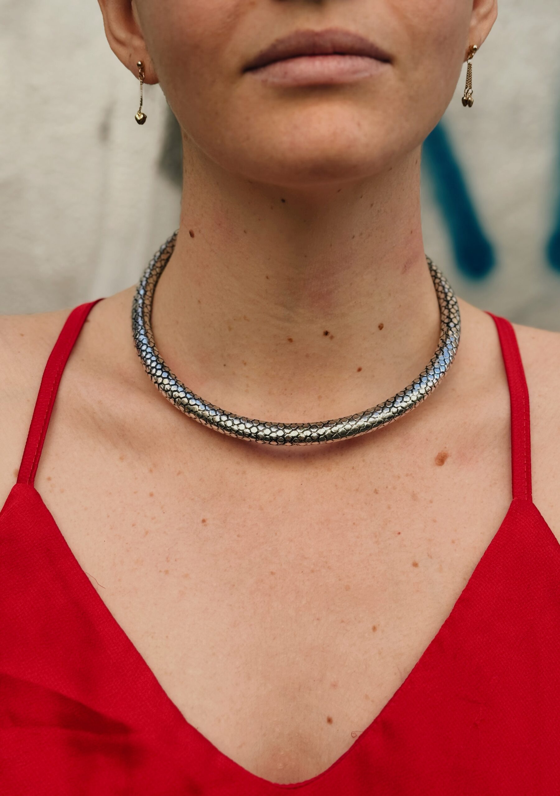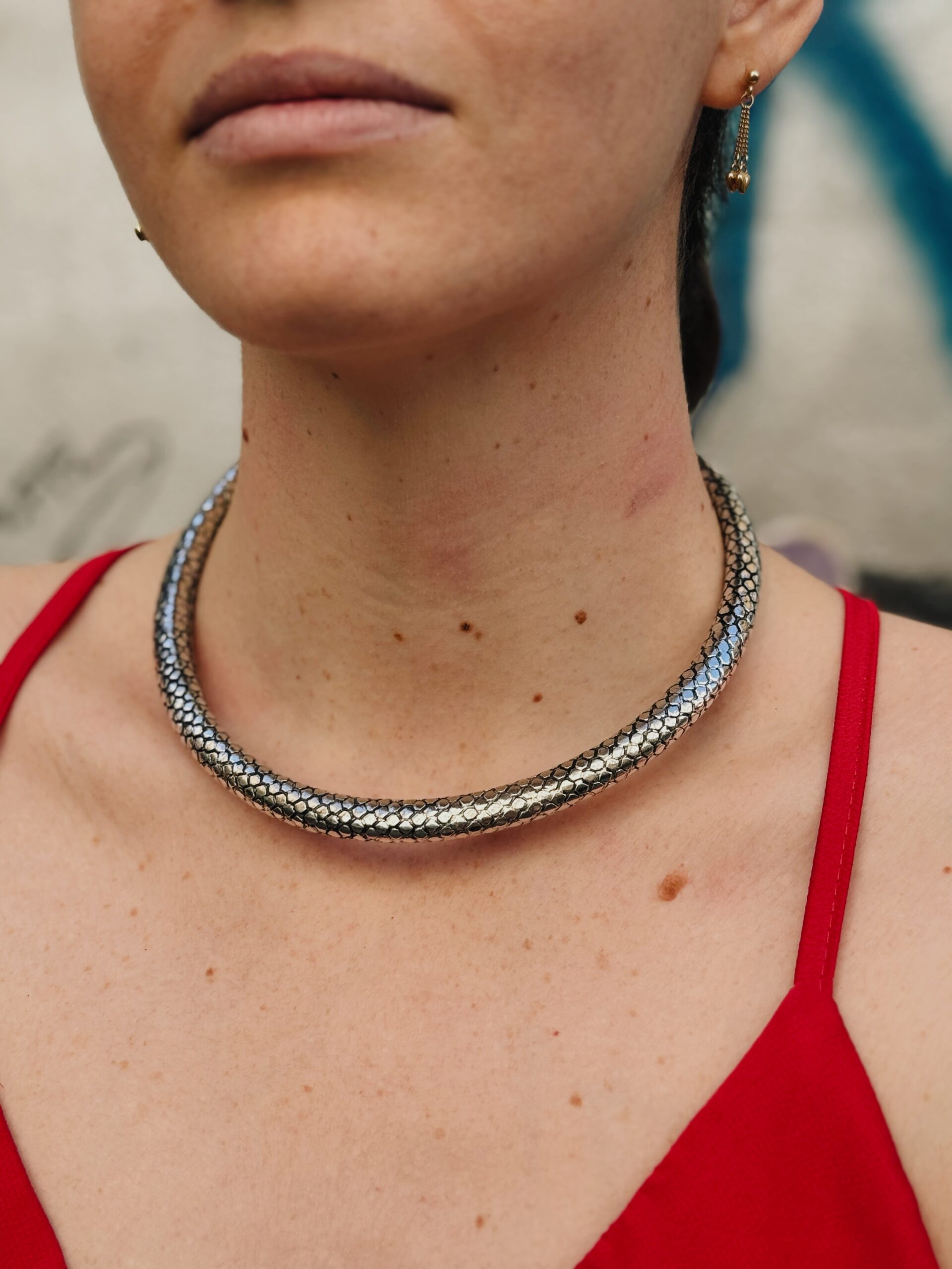 Maestoso collare in ottone pelle di drago in ottone. Gioiello artigianale con texture squamata che evoca creature mitologiche e potere ancestrale.