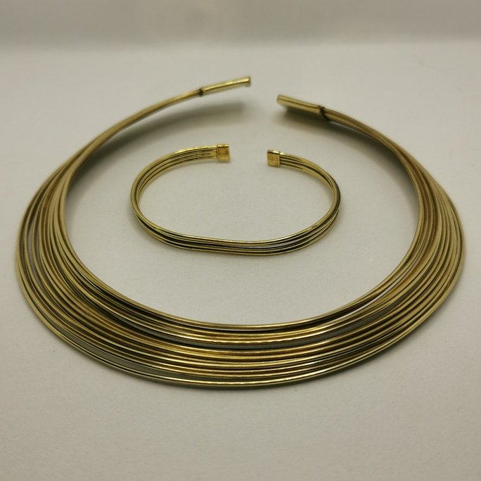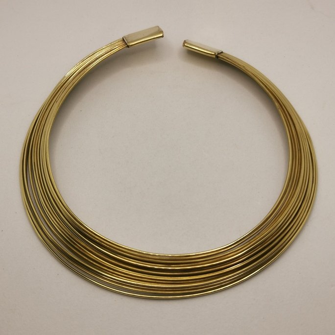Delicato collare in ottone Fili in ottone intrecciato. Gioiello artigianale che gioca con sottili linee metalliche per un effetto aereo e sofisticato.