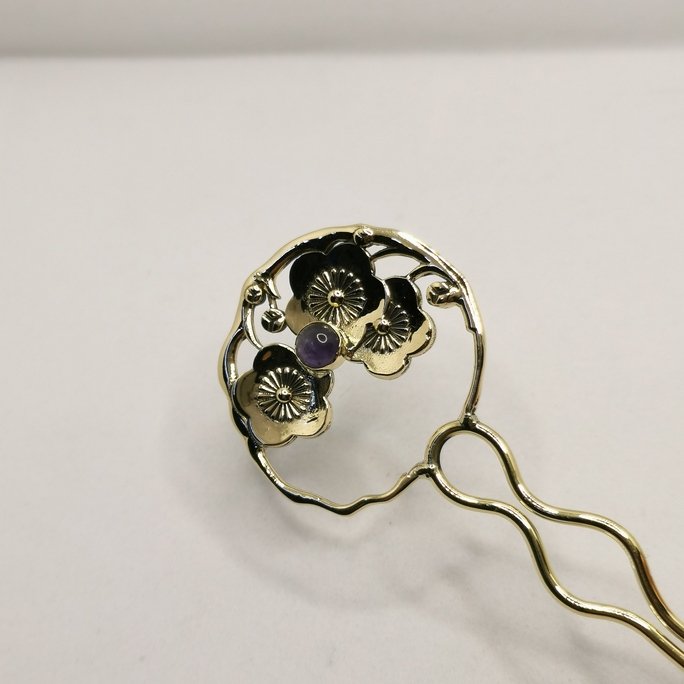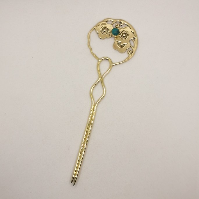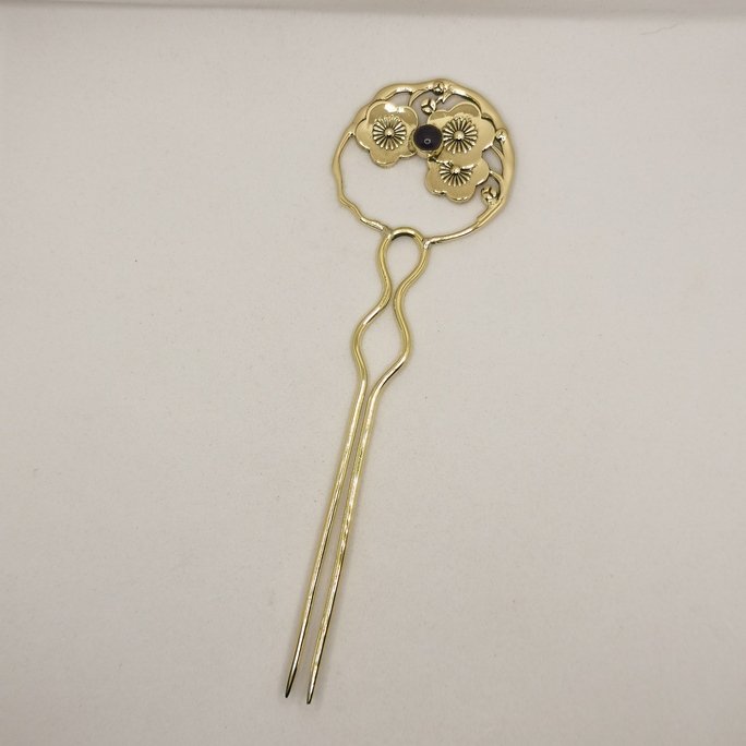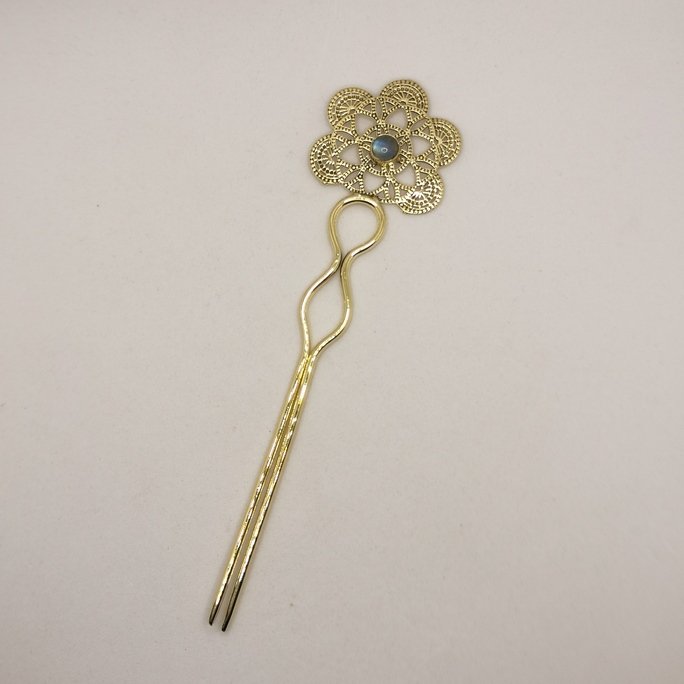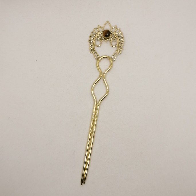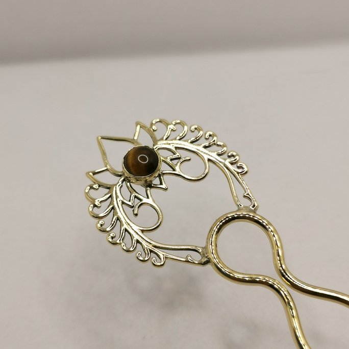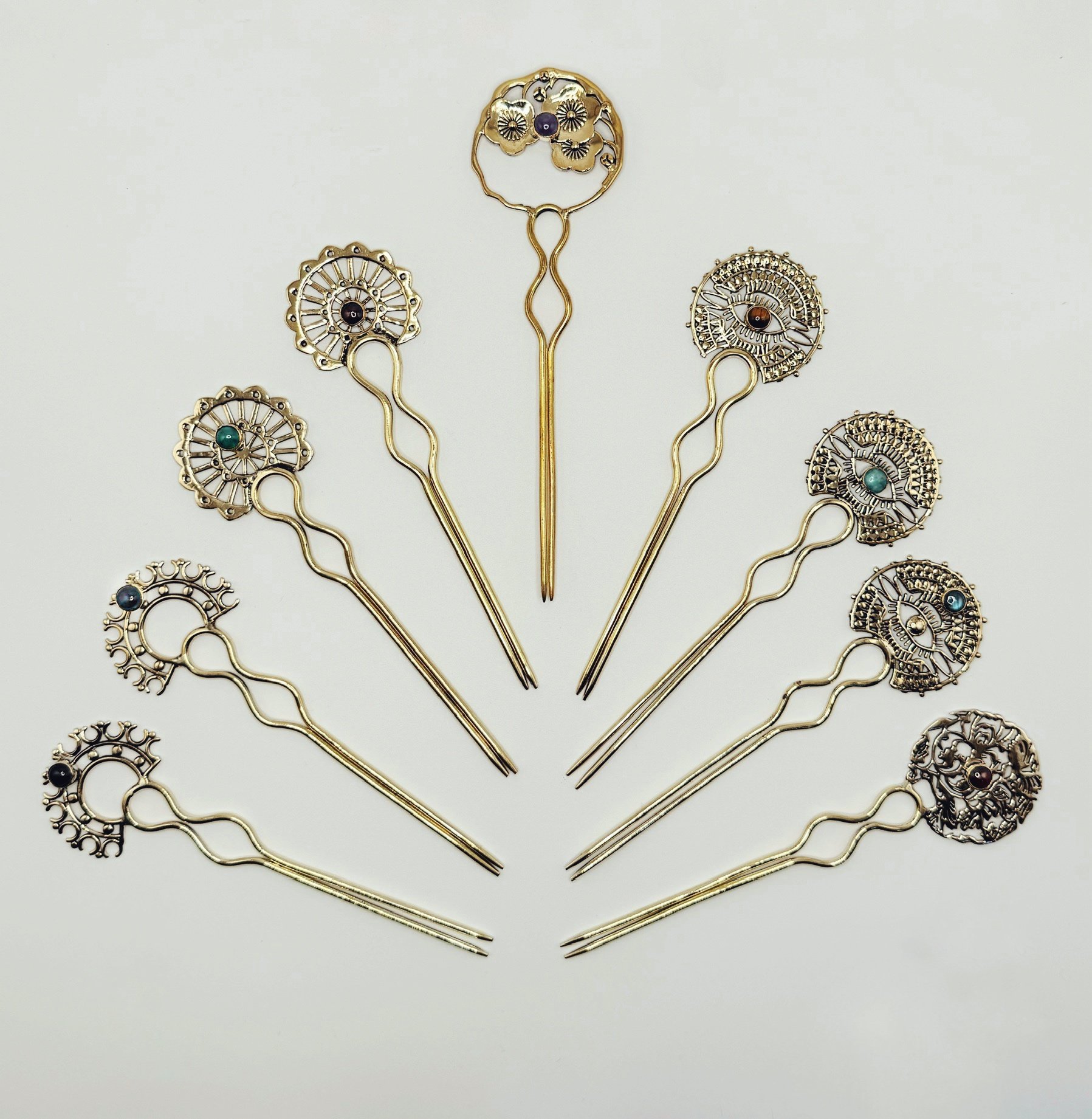 Eleganti spilloni fermacapelli in ottone con pietre naturali. Accessori artigianali che impreziosiscono le acconciature con gemme colorate.