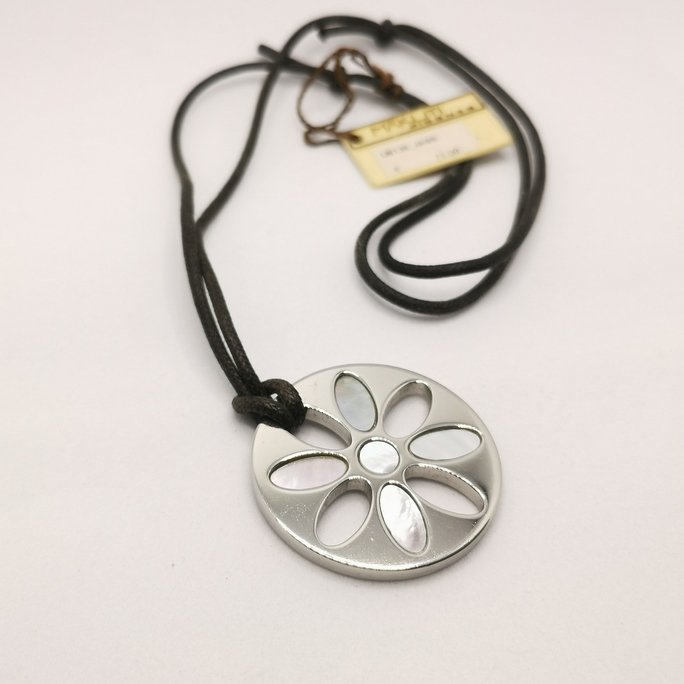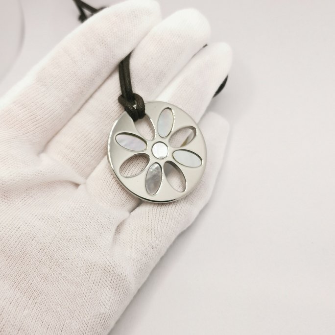 La madreperla, strato interno della conchiglia di alcuni molluschi, è apprezzata da millenni per le sue sfumature cangianti che sembrano catturare l’arcobaleno. Abbinata alla forma del fiore, crea un ciondolo che celebra la bellezza del mondo naturale in modo elegante e senza tempo.