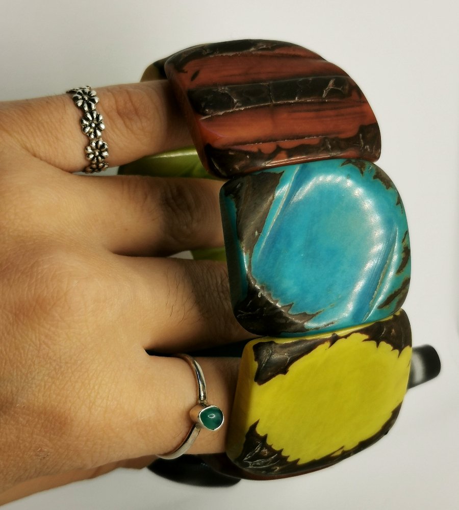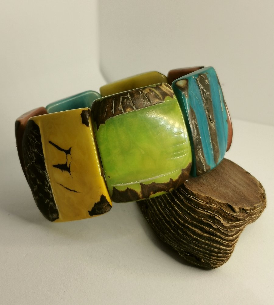 Splendido bracciale realizzato in avorio vegetale, la pregiata Tagua delle foreste pluviali sudamericane. Un materiale completamente ecologico, alternativa etica all’avorio animale.