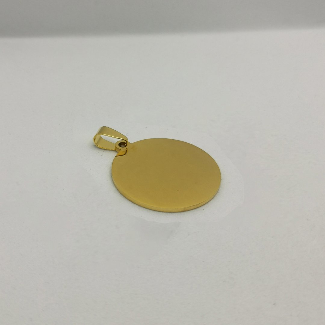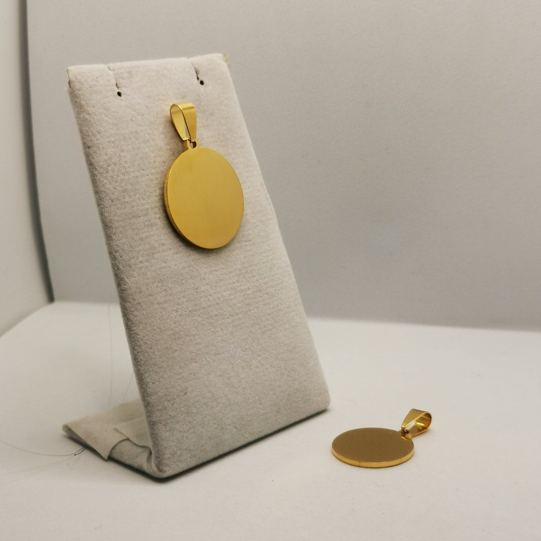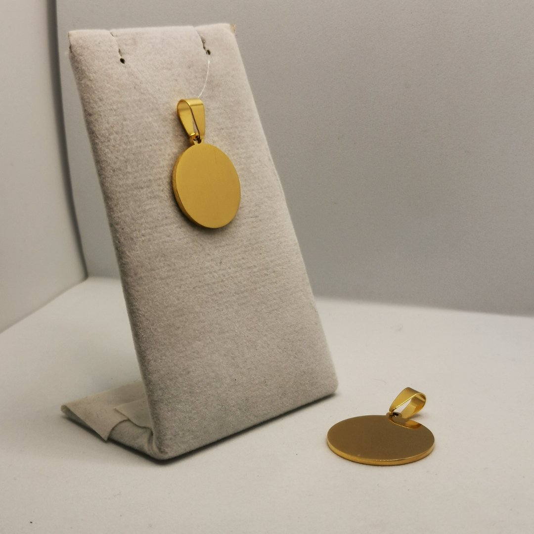Medaglia tonda dorata in acciaio con finitura gold elegante e superficie pronta per personalizzazioni. Il classico della gioielleria in versione preziosa.