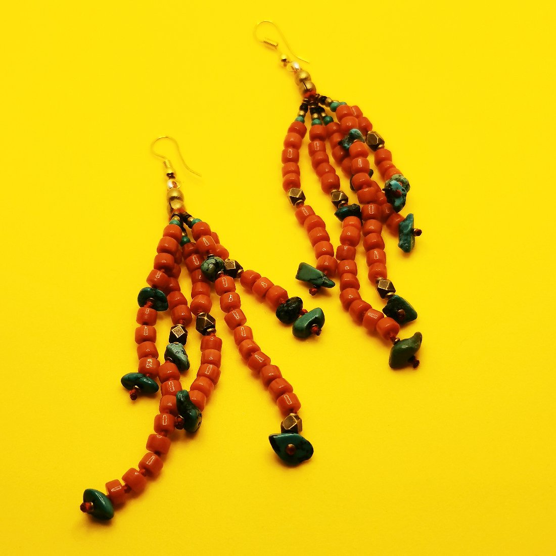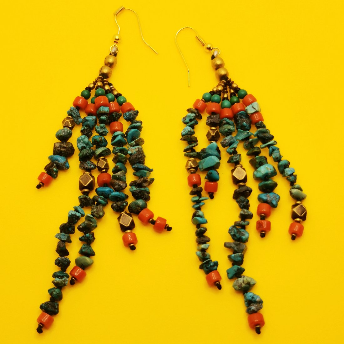 Orecchini artigianali in lega di ottone anallergico composti da 5 fili di perline di pietre naturali quali turchese e corallo.
