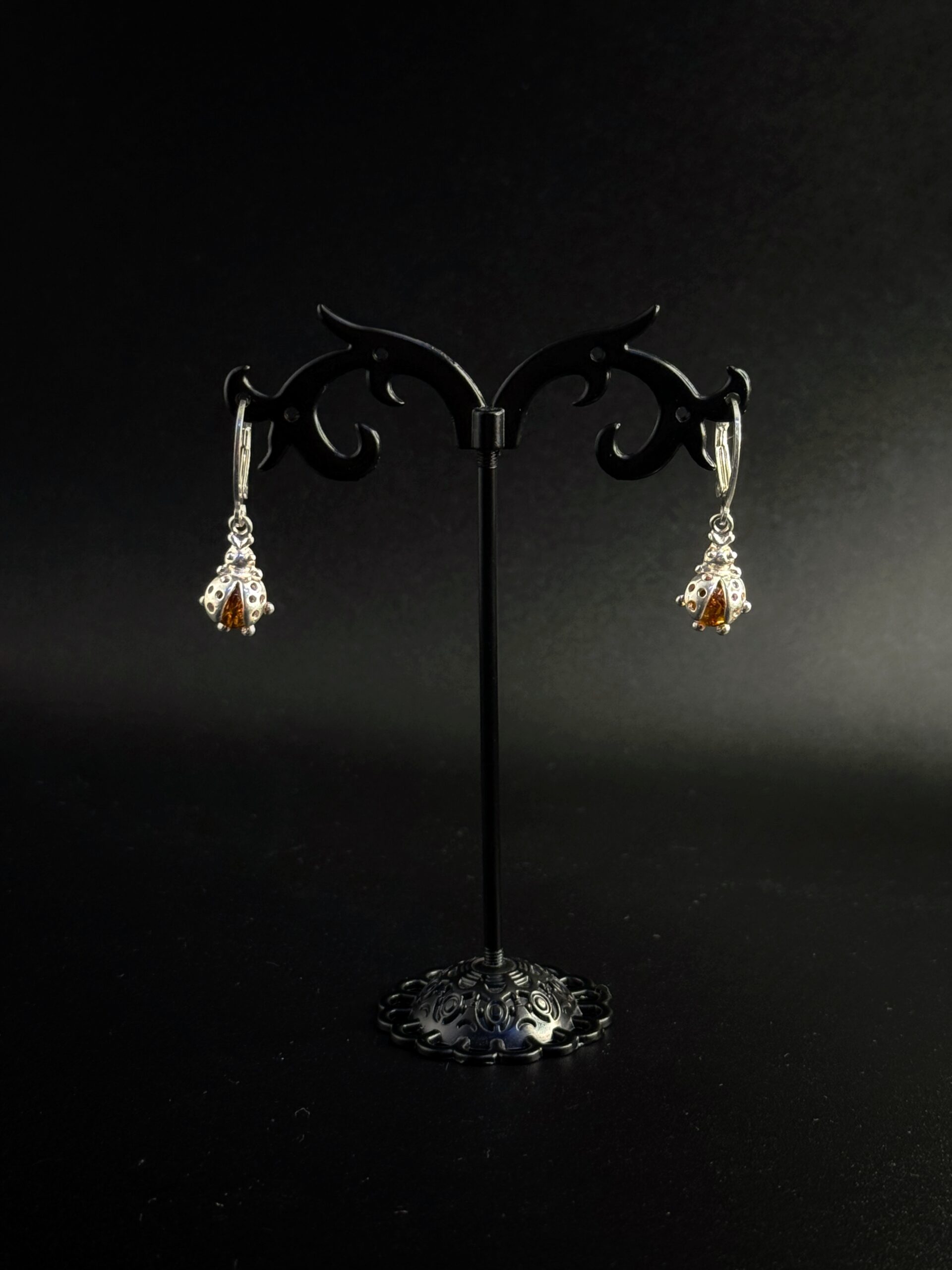 Fortuna alata. Questi orecchini in argento 925 sterling celebrano la coccinella portafortuna con design traforato dove struttura argentata puntinata forma il corpo dell’insetto proteggendo perla di ambra baltica cognac che rappresenta il cuore luminoso.