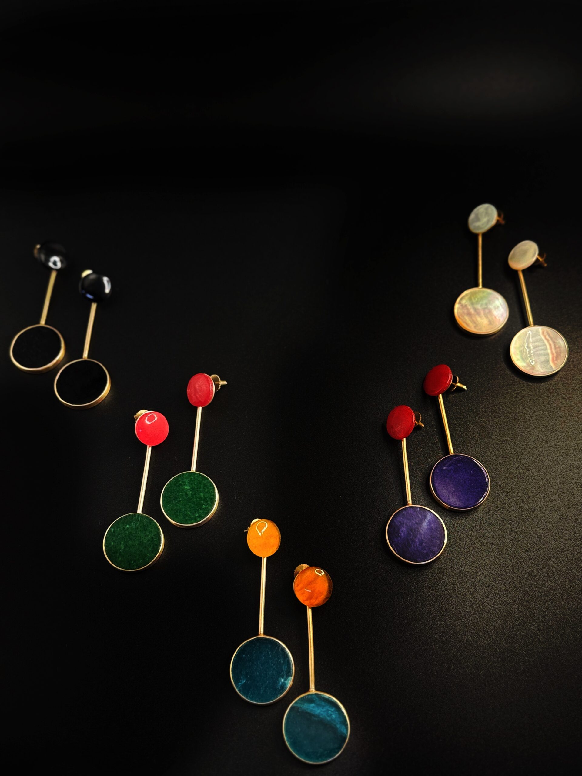 L’ottone lavorato a mano utilizzato è di qualità superiore e rivestito con oro 24 carati per una lucentezza duratura. I cerchi pendenti creano movimento e ritmo visivo, mentre le agate aggiungono punti di colore naturale.