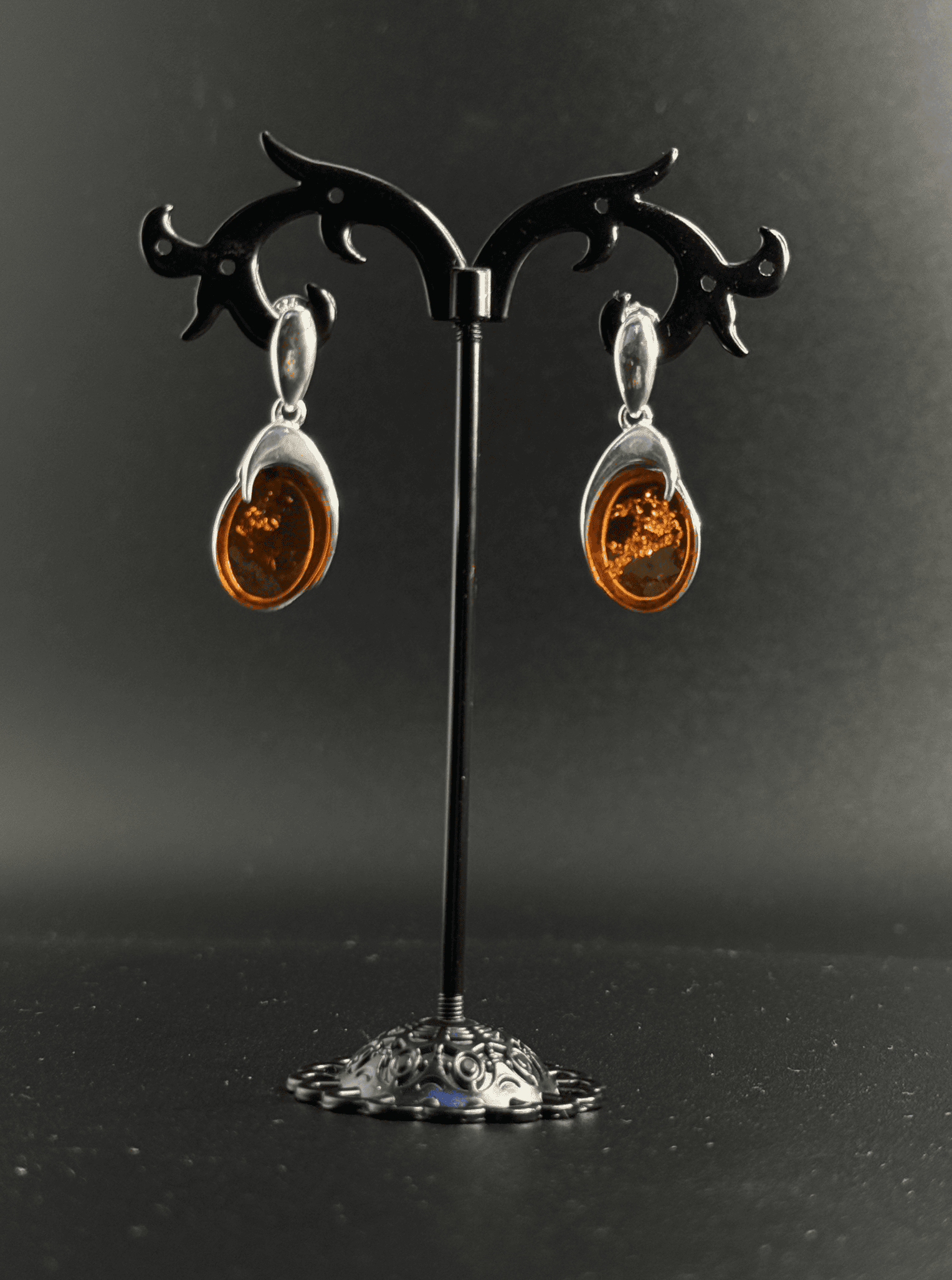 Orecchini artiginali in argento 925 ed ambra baltica, design a goccia ovale con cornice argentata avvolgente.