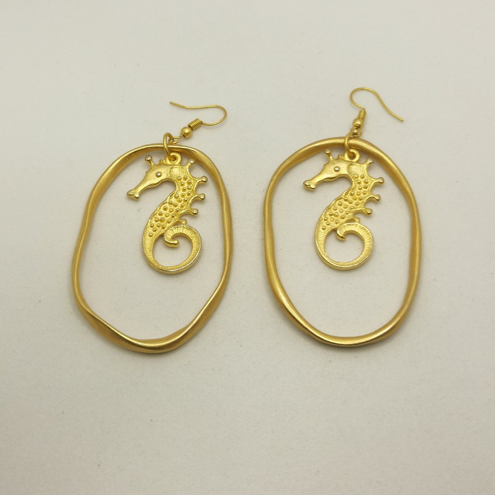 Questi orecchini dalla forma ad acquario con cavalluccio marino sono in lega di zama dalla finitura dorata, con chiusura a gancio.