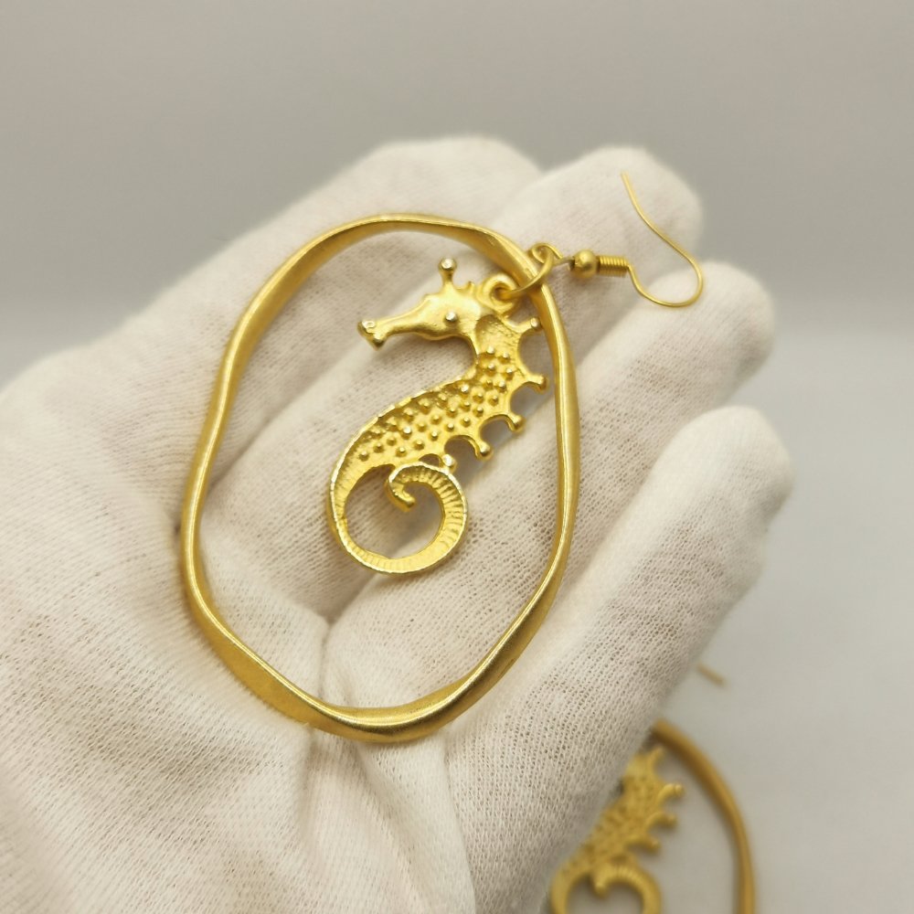 Questi Seahorse in a drop – earrigns incarnano l’essenza dello stile contemporaneo. Realizzati in lega di zama con una raffinata finitura dorata che cattura la luce, questi orecchini nascono dalla sapiente lavorazione artigianale che caratterizza ogni nostra creazione. Il design è stato pensato per chi desidera accessori capaci di raccontare una storia, pezzi unici che sanno farsi notare senza mai risultare eccessivi.