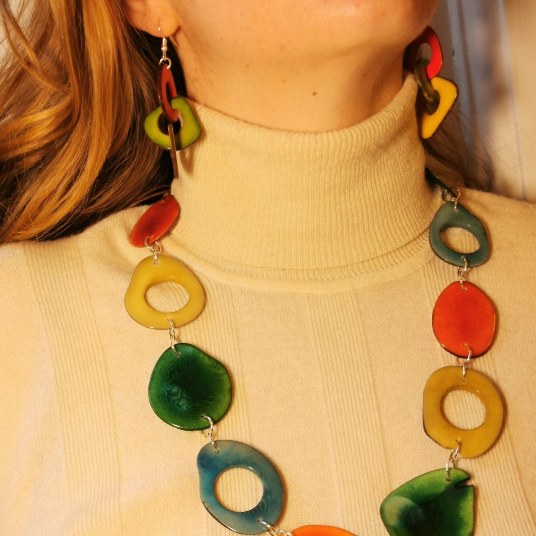 Questa Set Avorio vegetale – Colorful sections rappresenta un gioiello assolutamente unico nel suo genere, un pezzo che racconta storie di terre lontane e tradizioni millenarie. Realizzata interamente in avorio vegetale, questa collana nasce dalla sapiente lavorazione artigianale delle comunità sudamericane che da generazioni custodiscono i segreti di quest’arte. L’avorio vegetale, conosciuto anche come Tagua o Corozo, è il seme della palma Phytelephas che cresce nelle rigogliose foreste pluviali del Sud America.
