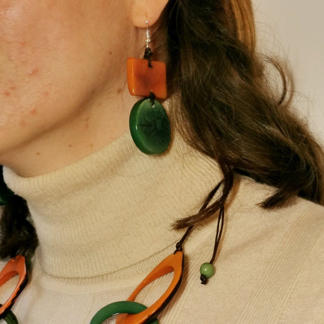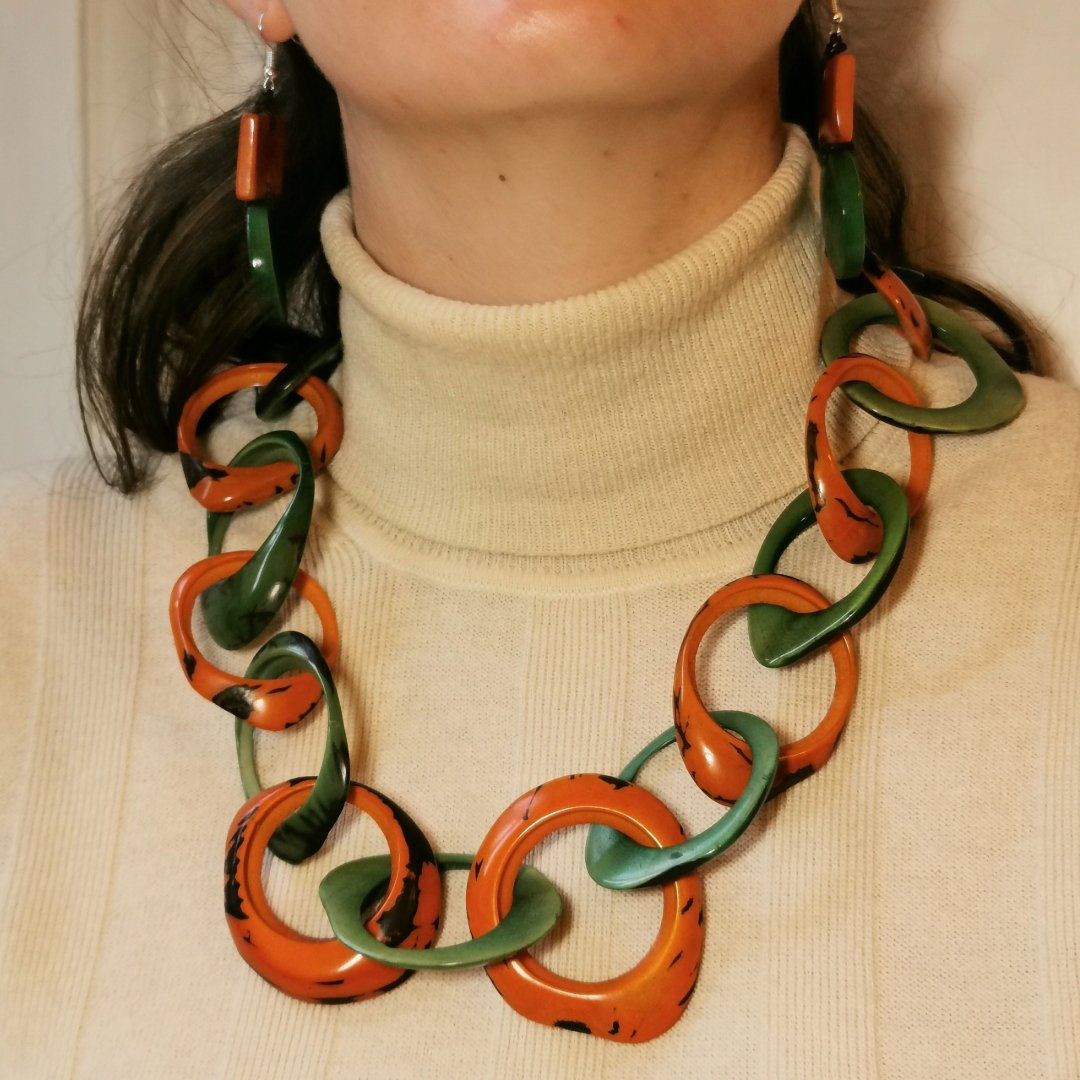 Questa Set Avorio vegetale – Orange Loop rappresenta un gioiello assolutamente unico nel suo genere, un pezzo che racconta storie di terre lontane e tradizioni millenarie. Realizzata interamente in avorio vegetale, questa collana nasce dalla sapiente lavorazione artigianale delle comunità sudamericane che da generazioni custodiscono i segreti di quest’arte. L’avorio vegetale, conosciuto anche come Tagua o Corozo, è il seme della palma Phytelephas che cresce nelle rigogliose foreste pluviali del Sud America.
