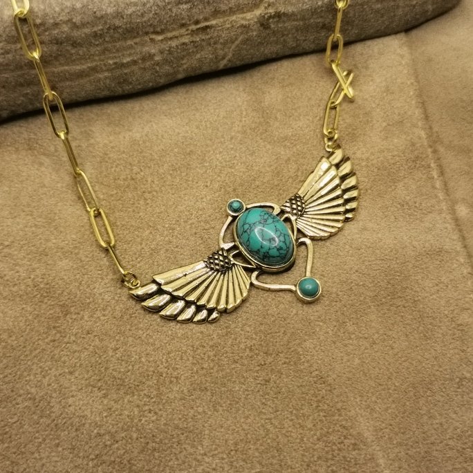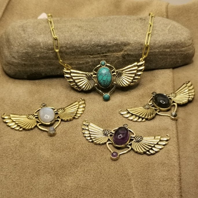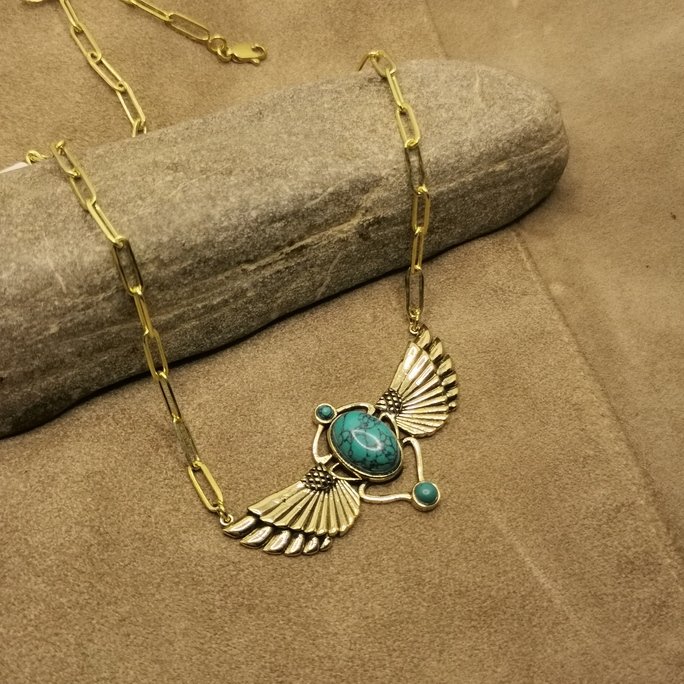 L’ottone lavorato a mano utilizzato per questa collana è di qualità superiore e viene modellato per creare ali che sembrano pronte a spiccare il volo. Le pietre naturali aggiungono punti di colore e luce che amplificano l’effetto celeste.