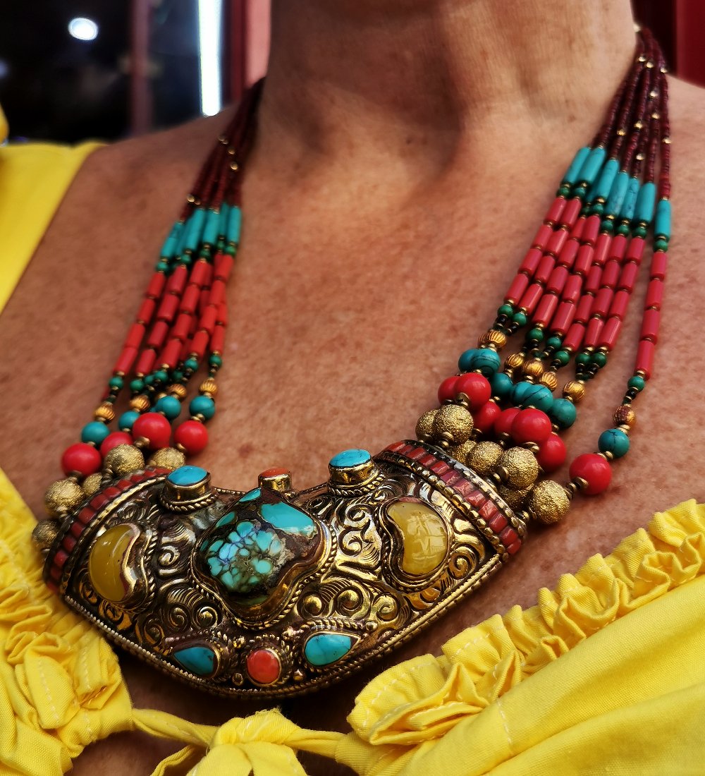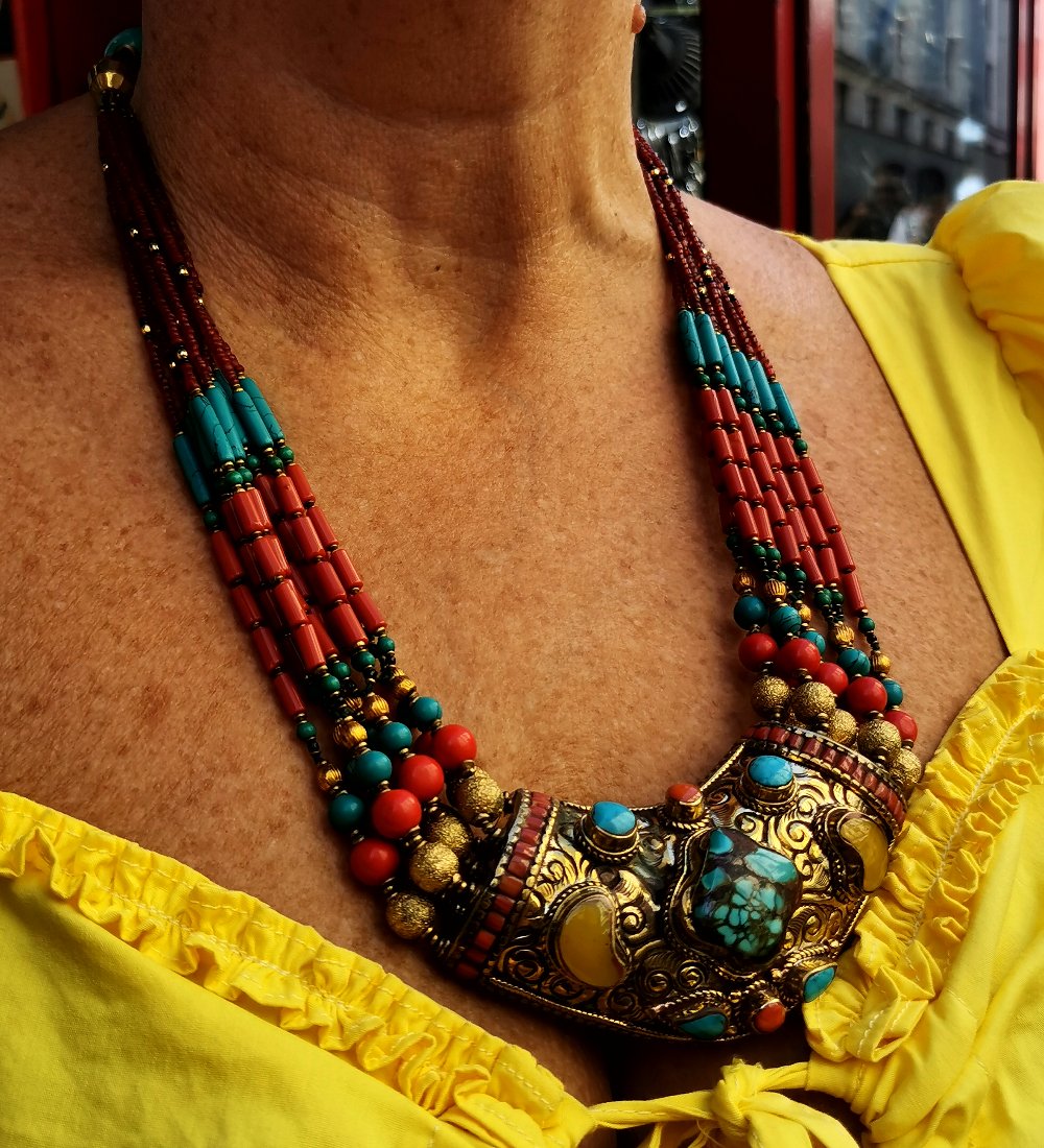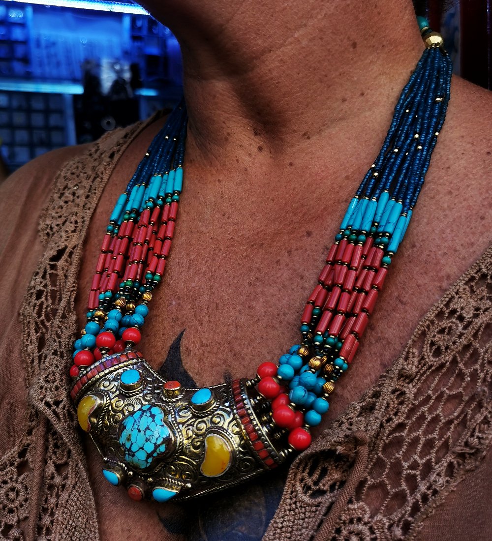 Collana artigianale in lega di ottone anallergico con pietre naturali quali turchese, ambra rossa e corallo bamù