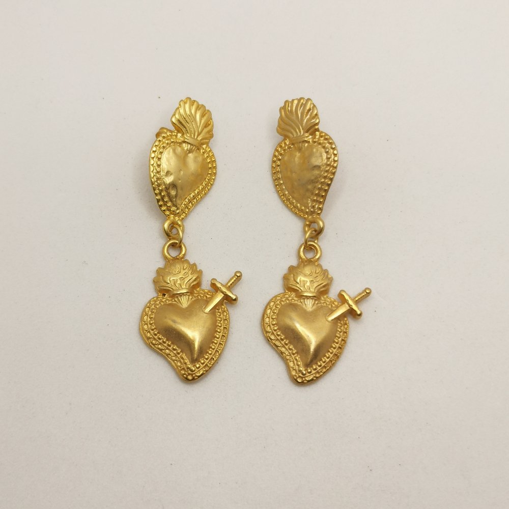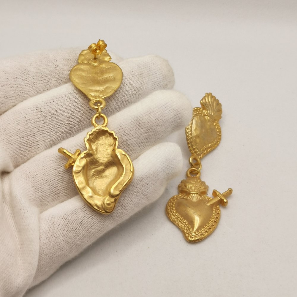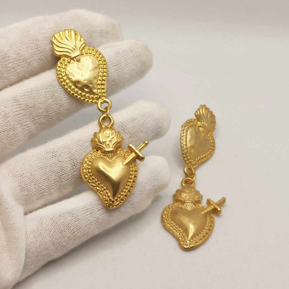 Elegante orecchini con doppio cuore sacro e cuore sacro trafitto in lega di zama, impreziositi da una finitura dorata, con chiusura a farfallina. Un accessorio dal carattere deciso che sa distinguersi con eleganza.