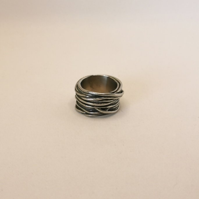 Anello Wire Wrapped in acciaio con design che simula fili metallici avvolti. Una tecnica artigianale tradizionale reinterpretata in un accessorio contemporaneo.