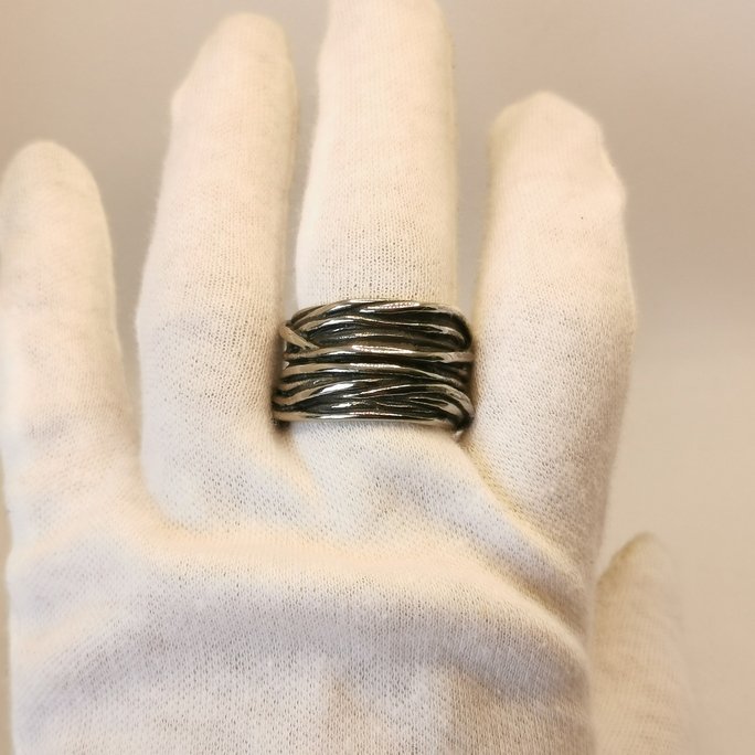 La tecnica del wire wrapping prevede l’intreccio di fili metallici per creare gioielli senza l’uso di saldature. Il risultato sono pattern complessi e affascinanti che sembrano cresciuti organicamente piuttosto che progettati. Questo anello cattura quell’estetica in una forma riproducibile ma che mantiene l’aspetto artigianale.